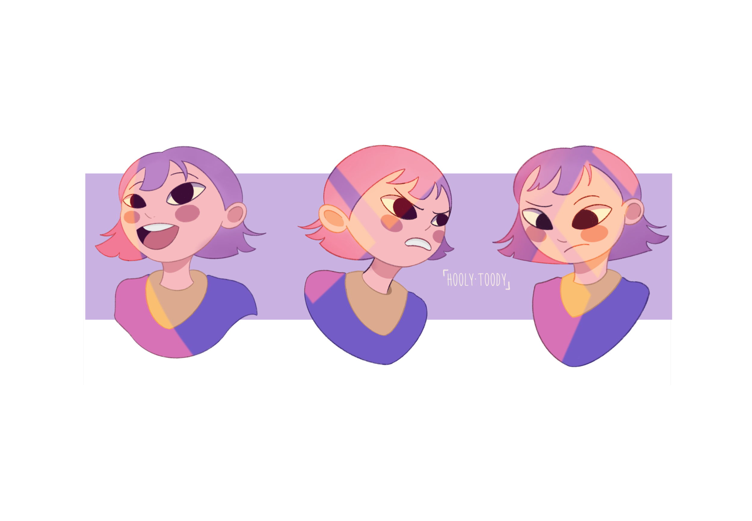 Une illustration d'une jeune fille avec des oreilles de chat, tenant un livre ou un cahier, portant des vêtements décontractés violets et bleus, avec une expression pensive.