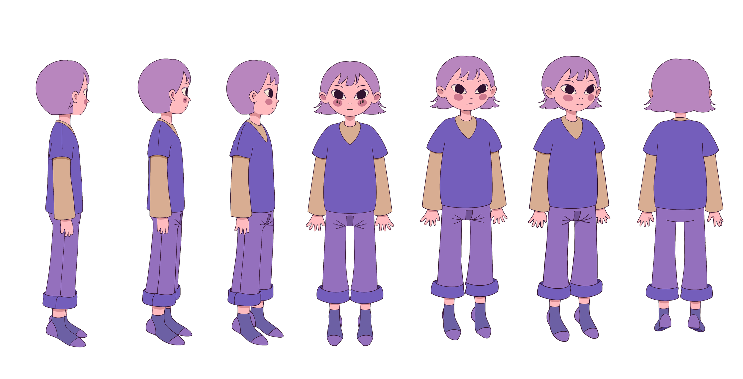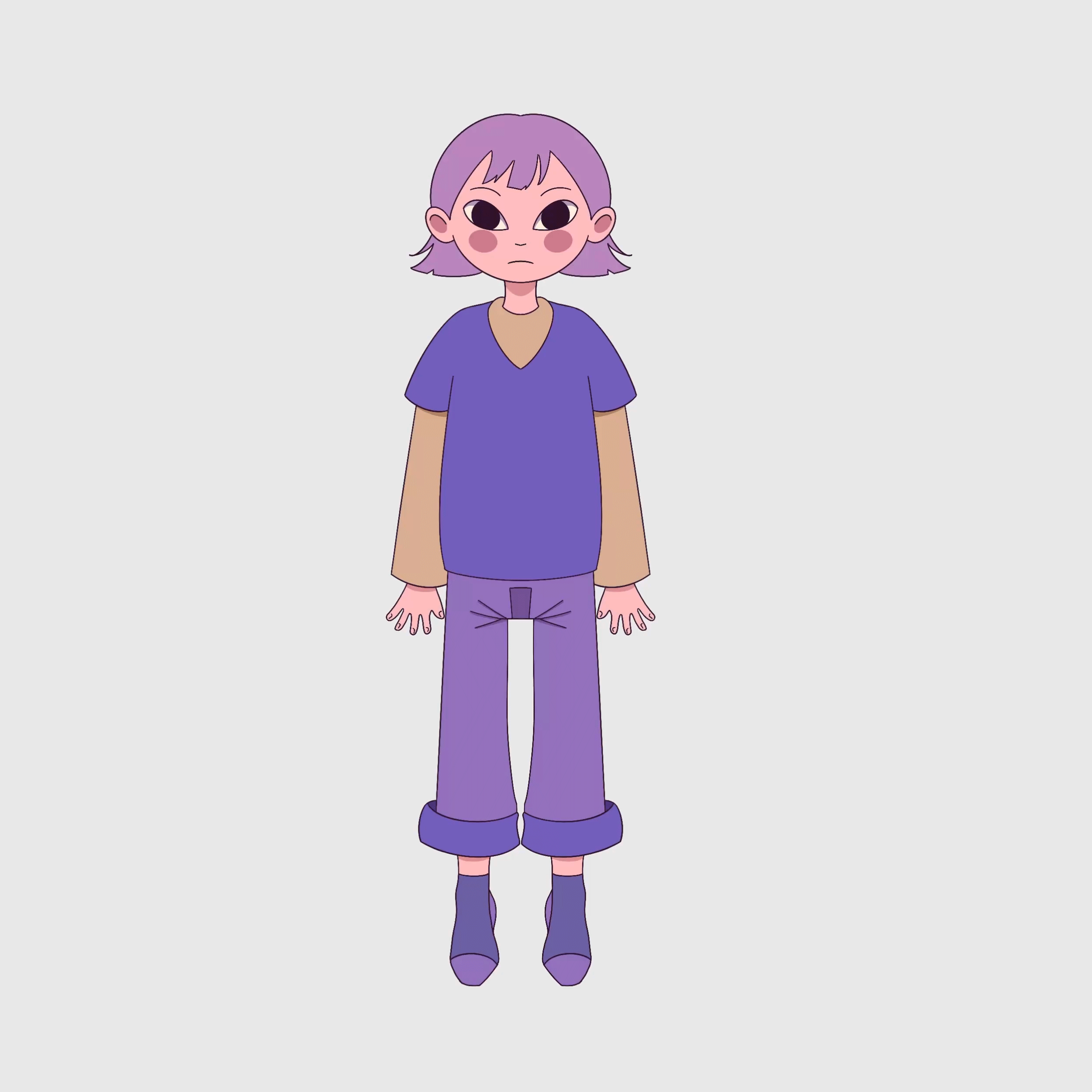 Dessin d'une jeune fille avec des cheveux courts, portant un t-shirt, un jean retroussé, des chaussettes et des chaussures, tenant un livre ou un cahier, dans une pose pensif ou curieux.